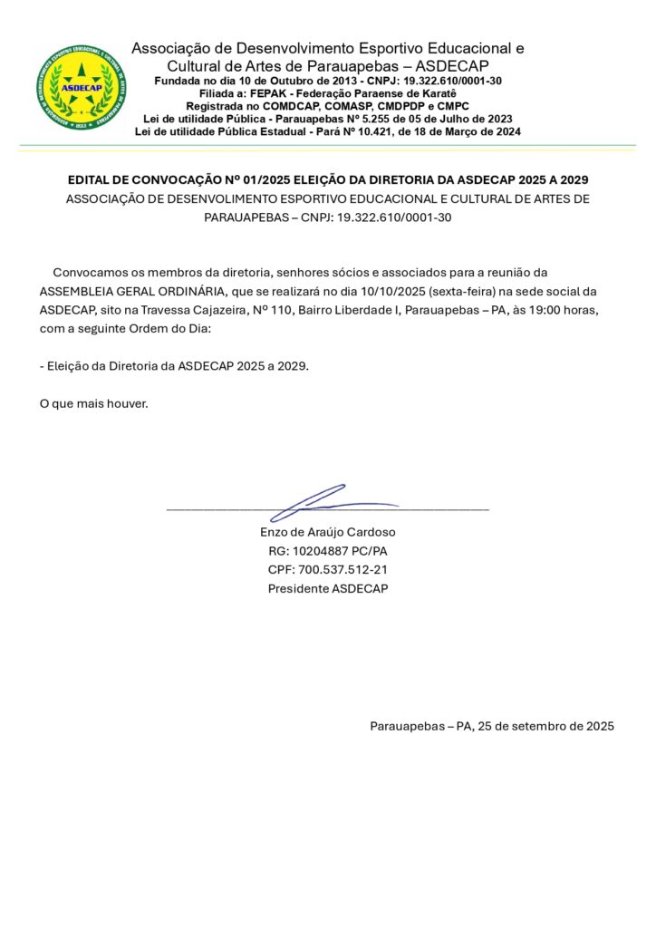 A Associação de Desenvolvimento Esportivo Educacional e Cultural de Artes de Parauapebas – ASDECAP publicou o Edital nº 01/2025, que convoca todos os membros da diretoria, sócios e associados para participarem da Assembleia Geral Ordinária destinada à eleição da nova diretoria da instituição para o mandato de 2025 a 2029.